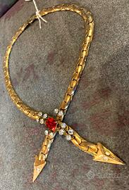 Collana anni 40 in metallo rodiato dorato , maglia mèches piatta con strass bianchi e uno rosso centrale.
