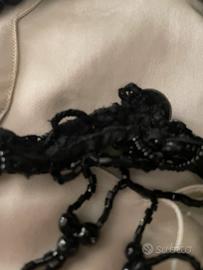 Questa collana nasce in un momento unico della storia di Trieste, quando la città viveva gli anni dell’occupazione anglo-americana e le serate si accendevano nelle sale da ballo, tra musica, eleganza e nuove atmosfere arrivate da lontano. Proviene dalla mia famiglia a Trieste, conservata con cura, ed è stata realizzata a mano da mia zia Annamaria. In quegli anni lei, insieme alla sorella Pia, frequentava i locali più raffinati della città, sempre accompagnata dal prozio Felice. In quel periodo Annamaria visse anche un legame affettivo con un ufficiale americano, un incontro intenso nato tra musica e serate danzanti, che sembrava destinato a diventare qualcosa di importante. Ma, come accadeva spesso in quegli anni, al ritorno in patria lui non si fece più sentire, lasciando dietro di sé un ricordo sospeso nel tempo. La lavorazione è artigianale e molto raffinata: una complessa struttura a rete realizzata con perline in vetro nero sfaccettato, con una parte centrale ricca e tridimensionale che dona movimento ed eleganza. L’interno in cordella di cotone garantisce comfort sulla pelle. Un oggetto che non è solo un accessorio, ma un piccolo racconto di vita, di musica e di eleganza di un’epoca irripetibile. Dettagli tecnici: * Circonferenza interna: circa 45 cm * Peso: circa 80 g * Materiali: perline in vetro nero + cordella di cotone * Lavorazione: artigianale complessa * Chiusura: gancio con asola * Epoca: anni ’40/’50 – periodo TLT L’occupazione anglo-americana di Trieste (1945–1954) seguì i 43 giorni di presenza jugoslava alla fine della Seconda Guerra Mondiale. Le truppe alleate presero il controllo della Zona A del Territorio Libero di Trieste (TLT), amministrando la città per conto dell’ONU fino al ritorno all’Italia. Ogni perlina sembra ancora seguire il ritmo di un lento, tra sorrisi, eleganza e una promessa rimasta sospesa nel tempo, come accadde a mia zia Annamaria in quegli anni di incontri e di addii.
