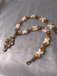 Questa collana vintage è un pezzo unico, che celebra la bellezza della lavorazione artigianale. La trama è intricata, creata con rocailles di vetro bianco e perline color ottone che si alternano in un delicato motivo a X lungo tutta la lunghezza della collana. Le perline color ottone sono intervallate da piccole perle di resina ambrata, che catturano la luce e aggiungono un tocco di calore.