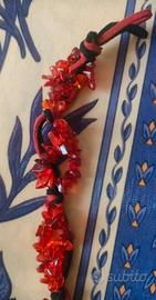 Gli elementi rossi sono assemblati con una tecnica che ricorda la lavorazione tubolare o a torcion, creando un effetto denso e tridimensionale. I frammenti sono intervallati o intrecciati con cordini di colore scuro (nero o marrone scuro) e rosso, che ne accentuano lo stile etnico e fatto a mano.