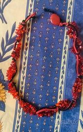 Questa collana artigianale è caratterizzata da un vivace colore rosso e da una struttura materica molto particolare.