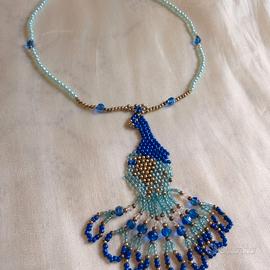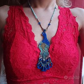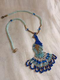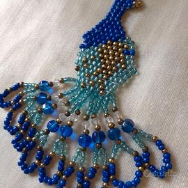 Questa collana artigianale Made in Italy celebra la maestosità del pavone con un design unico interamente intessuto a mano. Il pattern alterna perline cerate turchese chiaro a brillanti rondelle di cristallo blu, mentre il pavone centrale risalta per i dettagli in ottone e vetro dai riflessi metallici. La coda è finemente lavorata con biconi di cristallo e perline di vetro che catturano la luce. Lunga 45 cm e rifinita con moschettone in ottone, la creazione è realizzata senza colle o nichel utilizzando solo ago e filo. Un modello esclusivo in edizione unica, perfetto per donare un tocco di eleganza artistica a ogni occasione.