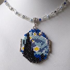 Questa raffinata collana artigianale rende omaggio alla Notte Stellata di Van Gogh attraverso una meticolosa tessitura di perline Miyuki Delica. Il medaglione centrale cattura i celebri vortici celesti e l'iconico cipresso con precisione cromatica, incastonato tra dettagli metallici. La catena, lunga circa 43 cm, alterna bugles di vetro a finissimo cristallo ceco, creando un gioco di trasparenze e riflessi che esalta il ciondolo senza appesantirlo. Completata da una chiusura in acciaio antiallergico, l'opera unisce l'eccellenza dei materiali a una sensibilità artistica senza tempo. È un gioiello leggero e ricercato, perfetto per chi ama portare l'arte con sé