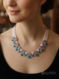 Questa raffinata collana choker in stile boho chic contemporaneo rappresenta un esempio d'eccellenza nell'arte del bead weaving. Intessuta meticolosamente a mano, la creazione alterna con precisione cromatica perline rosa, nero e rosa metallico, dando vita a un pattern geometrico armonioso e sofisticato. Il design è impreziosito da accenti blu che donano un tocco di vibrante contrasto alla composizione, fondendo l'anima artigianale a un'estetica moderna. Lunga 41 cm, la collana si chiude con un moschettone in acciaio inox antiallergico, garantendo comfort e durevolezza. Grazie alla sua qualità premium, è l'accessorio ideale sia per eventi formali sia per elevare con eleganza la vita di tutti i giorni.