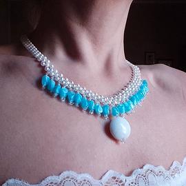 Questo raffinato girocollo in stile Princess è un capolavoro di artigianato fine premium, realizzato interamente a mano con la complessa tecnica del bead weaving. La struttura intreccia perle cerate bianche che sostengono una corona di elementi in resina azzurra dalle forme irregolari, richiamando l’estetica vittoriana e vintage. Al centro, una preziosa sfera in ceramica siciliana sigilla il design con un tocco mediterraneo di rara eleganza. Lunga 42 cm e dotata di una pratica chiusura in acciaio inox, questa collana è un gioiello esclusivo che fonde tradizione e modernità in un abbraccio regale.