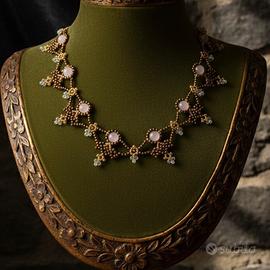 Questa esclusiva collana choker è un raffinato pezzo unico interamente intessuto a mano con la meticolosa tecnica del bead weaving. Il design fonde l'eleganza dello stile edoardiano con un fascino retrò e vintage, alternando la calda lucentezza delle rocailles color bronzo alla delicatezza naturale delle gemme di quarzo rosa. I dettagli in autentico cristallo di Boemia catturano la luce regalando riflessi preziosi e sofisticati. Completano il gioiello una pratica chiusura con moschettone e una catenella in ottone, garantendo una vestibilità perfetta. Un accessorio distintivo e senza tempo, ideale per chi cerca l'esclusività dell'artigianato d'alta qualità.