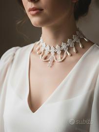 Questo choker artigianale è un capolavoro di bead weaving che fonde l'eleganza rococò con un'estetica perfetta per una sposa o una cerimonia romantica. Realizzato interamente a mano, il gioiello intreccia perline cerate e luminose perle di Maiorca, impreziosite da delicati accenti in quarzo rosa e cristalli scintillanti che catturano la luce a ogni movimento. La struttura raffinata evoca i pizzi d'epoca, offrendo un design senza tempo che valorizza il décolleté con un tocco regale. Grazie alla lunghezza di 34 cm e alla catenella di estensione di 6 cm, si adatta perfettamente a ogni silhouette, unendo comfort e ricercatezza vintage.
