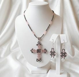 Questa raffinata parure gothic-chic fonde la sacralità del simbolo con un’estetica romantica e misteriosa. Il set è composto da un’importante croce tessuta a mano, dove la calda brunitura dell’ottone incontra la luce delicata dei cristalli rosa chiaro in un contrasto cromatico sofisticato. La collana, lunga 43 cm, scivola con eleganza sul décolleté grazie a una chiusura in ottone sicura e coordinata. Gli orecchini riprendono il motivo geometrico del pendente, completando il look con un tocco di luce dinamica. Un set artigianale perfetto per chi desidera un accessorio distintivo dal fascino neo-vittoriano.