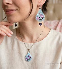 Questo raffinato set di gioielli in tessitura di perline incarna l'eleganza della tradizione artigianale giapponese. Il design richiama la delicatezza dei fiori di ciliegio, con petali lilla e centri scuri che sbocciano su un etereo sfondo azzurro pastello. La precisione millimetrica della trama, tipica delle perline Miyuki, crea un equilibrio perfetto tra geometria e natura. Gli orecchini a rombo, impreziositi da sfere di agata viola, dominano la scena con la loro struttura slanciata, mentre il ciondolo riprende il motivo floreale in una scala più piccola e discreta. Un insieme armonioso che trasmette serenità zen e classe.