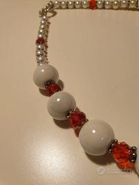 Collana di bigiotteria con perline bianche e pietre fucsia.