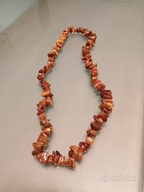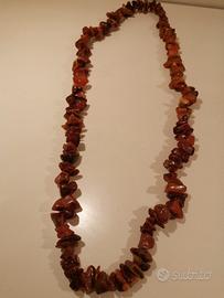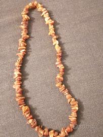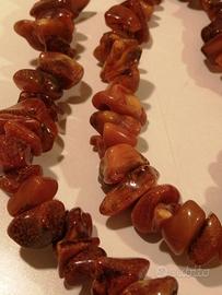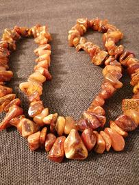 Collana di ambra baltica grezza formata da chips di ambra solo parzialmente lucidate così da mantenere nella sua buccia un alto contenuto di acido succinico che è il principio attivo di questa resina fossile. L'ambra grezza è considerata Pietra di protezione e di equilibrio che lavora sull'armonizzazione del terzo Chakra.