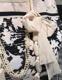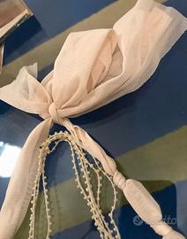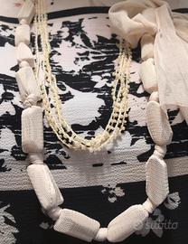 Originale collana con pietre rivestite in tulle beige, chiusura con fiocco laterale, lunghezza della collana regolabile. Doppio utilizzo come cintura,lunghezza totale cm.154. A corredo anche una collana a più fili con perline beige. Entrambe possono essere indossate singolarmente. Nuova, mai indossata , ha la sua busta con il laccetto in plastica del cartellino . Acquistata in profumeria.