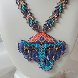 Questa creazione rappresenta una vera e propria opera d'arte da indossare, dove la millenaria ispirazione dell'arte Huichol incontra la precisione delle perline di vetro giapponesi Miyuki. La collana, lunga 45 cm, si distingue per un raffinato pattern a spiga che converge verso una maestosa testa di elefante centrale, simbolo di saggezza e forza. Ogni singolo elemento è frutto di una sapiente maestria artigianale che rende questo set un pezzo unico e irripetibile. Le sfumature multicolore vibrano su una struttura solida, completata da ganci e chiusura a moschettone in pregiato ottone. Un modello artistico esclusivo pensato per chi cerca un gioiello etnico dall'anima profonda.