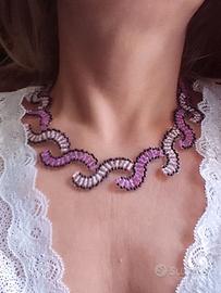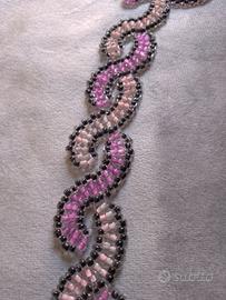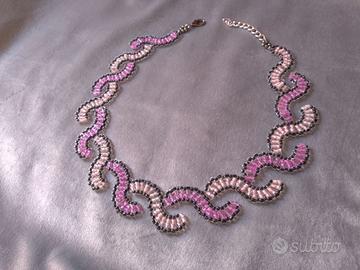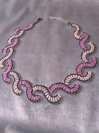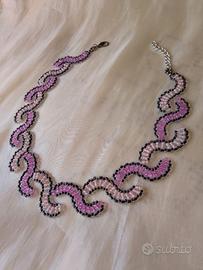 Collana girocollo artigianale, realizzata con perline di vetro di colore rosa pastello, lilla e nero. I colori sono delicati ed eleganti.