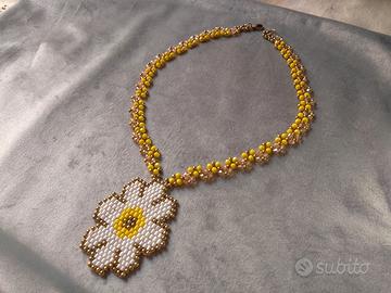Collana con Margherita. Intessuta con rondelle di cristallo di colore giallo e ambra e beads di ottone.