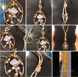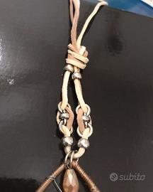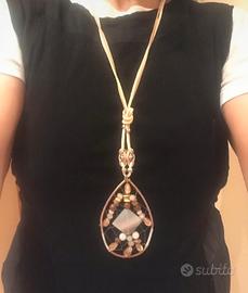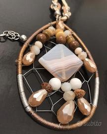 Originale collana lunga con laccio in cuoio beige, chiusura regolabile in lunghezza con moschettone. Grande pendente a forma di goccia con pietre dure e sfere in legno. Lunghezza collana 50 cm.