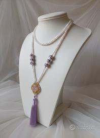 Questa raffinata creazione artigianale evoca l'eleganza senza tempo degli anni Venti, combinando il fascino delle perle di Maiorca a un design a doppio filo di ispirazione Art Déco. Il primo giro accarezza il collo con i suoi 40 cm, mentre il secondo scende morbidamente per 59 cm, culminando in un pendente magnetico: un ciondolo in lepidolite dalle sfumature delicate unito a una nappa in preziosa ceramica siciliana. Ogni dettaglio riflette una maestria manuale che celebra il vintage e la tradizione mediterranea, rendendo questo gioiello un pezzo unico perfetto per chi cerca uno stile distintivo e sofisticato che profuma di storia e bellezza senza tempo.