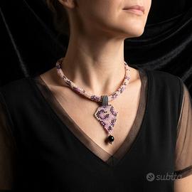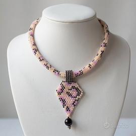 Questa splendida collana choker in stile boho etnico chic si distingue per la sua raffinata struttura tubolare a motivo maculato, realizzata interamente a mano con pregiate perline Miyuki Delica in vetro. Il design gioca su delicate tonalità rosa cipria multicolore che sfumano in un pendaglio geometrico dal carattere deciso con trama leopardata. Un’elegante perla nera in resina completa il ciondolo, donando un punto luce profondo. Lunga 42 cm, la collana assicura una vestibilità perfetta grazie alla pratica chiusura artigianale con perla e cappietto in ottone. Un accessorio unico, capace di unire artigianalità e tendenza contemporanea.