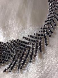 Questa collana unica è una vera opera d'arte tessile, interamente intessuta a mano con meticolosa cura per un effetto spettacolare. Il modello presenta un esclusivo design "piumato" che si rifà al raffinato stile vintage Art Déco degli anni '20, evocando un'eleganza geometrica e sofisticata. È una creazione in edizione unica, garantendo che chi la indossa possieda un gioiello irripetibile.