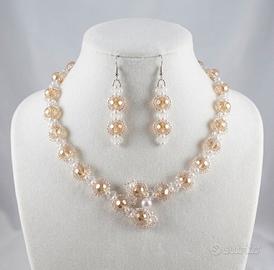 Questa raffinata parure artigianale in stile classico nasce da una minuziosa tessitura bead weaving che modella il girocollo in una sinuosa forma serpentata. Lunga 42 cm, la collana incastona pregiati cristalli Maxima originali boemi color champagne, celebri per la loro straordinaria lucentezza, alternati a candide perle e minuteria in acciaio antiallergico premium. Il design culmina in un elegante intreccio frontale asimmetrico, richiamato dagli orecchini pendenti coordinati. Un set esclusivo e sofisticato, perfetto per una sposa o una cerimonia elegante, che unisce la tradizione del cristallo boemo alla sicurezza di materiali d'eccellenza.