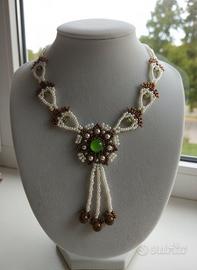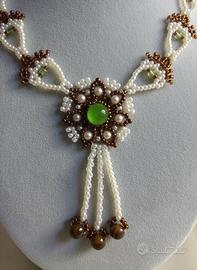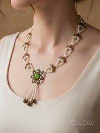 Questa collana è un prezioso esempio di stile Art Nouveau moderno, un gioiello che fonde l'eleganza vintage con una raffinata lavorazione artigianale in tessitura di perline. Il design si sviluppa attorno a un cabochon floreale centrale, impreziosito da una gemma di occhio di gatto verde e arricchito da una frangia mobile con gemme di occhio di tigre. Intrecci di rocailles bronzo e marrone dorato si fondono a perline bianco cerato e biconi in cristallo verde, creando armonie naturali. Lunga 47 cm, la creazione avvolge il collo con grazia d’altri tempi, assicurata da una pratica chiusura in acciaio inox anallergico. È un pezzo unico che celebra la natura con fascino sofisticato e intramontabile.