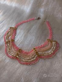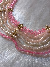 Collana Girocollo Collarino Artigianale Perle Avorio Imitazione Miyuki Rosa Rosso Drappeggiata Beads Dorati 43cm