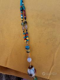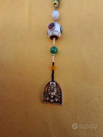 Collana originale tibetana di Mahalakala, lunga, tutta lavorata a perle colorate, molto belle (la foto non rende); la medaglia presenta su un lato il volto della divinità tantrica e sull' altro il mantra corrispondente in tibetano. Mahalakala è considerato il grande protettore del Dharma