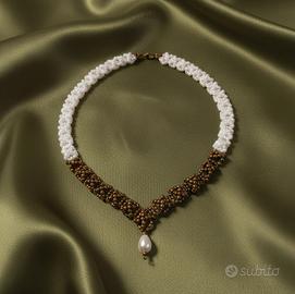 Questa esclusiva collana choker a V incarna l'eleganza sartoriale degli anni Quaranta. Realizzata interamente a mano con la meticolosa tecnica della tessitura di perline, fonde il calore antico delle rocailles bronzo alla purezza delle perle bianche cerate. Il design geometrico culmina in una raffinata perla di fiume pendente che illumina il décolleté con un tocco di classe senza tempo. Lunga 43 cm, è un pezzo unico non reperibile nei negozi, perfetto per chi cerca un accessorio distintivo dal fascino retrò e artigianale. Un gioiello che trasforma ogni outfit in una dichiarazione di stile esclusiva e ricercata, ideale per amanti del vero vintage e del fatto a mano.