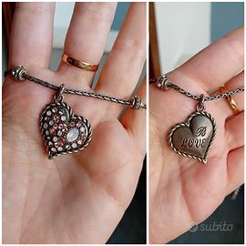 La chiusura a moschettone è decorata con un cuore e la misura è regolabile grazie alla catenella di prolungamento che termina con un cuoricino logato.