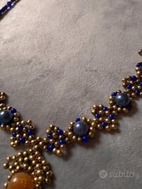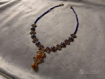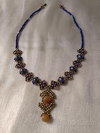 Intessuta con perle cerate di colore blu e beads di ottone invecchiato con ciondolo centrale, realizzato con bellissime gemme di giada marrone/dorato non trattata.