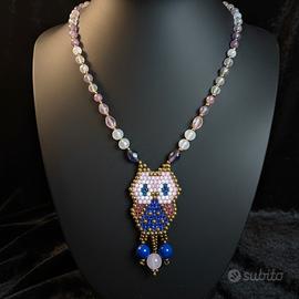Collana artigianale in stile boho etnico con cristalli e ciondolo gufo con pietre naturali pendenti.