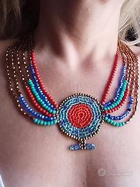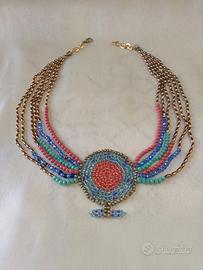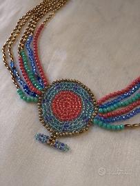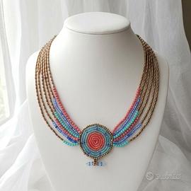 Collana Artigianale etnica multiflo stile Cleopatra Antico Egitto Occhio di Horus. Questa raffinata collana multifilo celebra l'eleganza regale dello stile Cleopatra con un design che evoca il fascino dell'antico Egitto. Caratterizzata da una minuziosa tessitura manuale, l'opera integra cristalli Miyuki e perline in vetro dalle vibranti tonalità turchese e rosso, accostate a luminose catenine dorate. Il medaglione centrale, che richiama il simbolismo dell'occhio di Horus, funge da fulcro magnetico di questo gioiello etnico. Perfetta per chi cerca un accessorio distintivo e artigianale, la creazione fonde sapientemente storia e contemporaneità in un pezzo unico.
