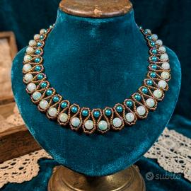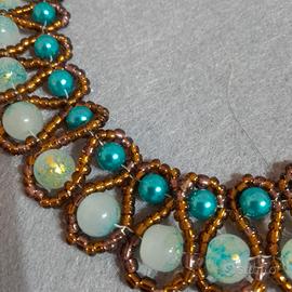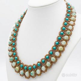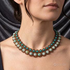 Collana Choker Cleopatra fatta a mano Boho Chic stile Etnico Pietre dure howlite. Questa collana choker in micro-tessitura manuale esprime un raffinato stile boho-chic. Il pattern è caratterizzato da una trama di ovali in Miyuki marrone metallico che incornicia grandi perle di howlite tinta, le cui venature naturali contrastano con la brillantezza delle perle cerate turchese. Lunga 41 cm con chiusura in acciaio inox antiallergico, la struttura a pizzo tridimensionale bilancia i riflessi bruniti del vetro con le vivaci tonalità delle pietre, creando un gioiello artigianale dalla personalità decisa.