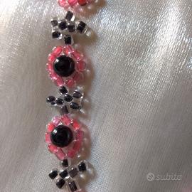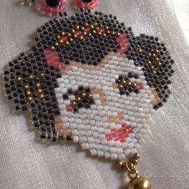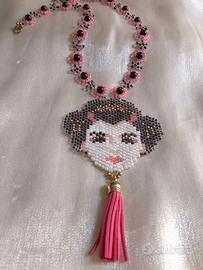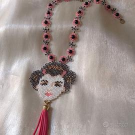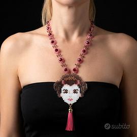Collana artigianale lunga floreale in stile Etnico giapponese con pendente viso di donna geisha e nappa. Nero, rosa. Questa collana lunga 58 cm è un capolavoro di bead weaving realizzato a mano in Italia, caratterizzato da un raffinato ciondolo raffigurante un volto di Geisha. Il pattern floreale è intessuto con cura utilizzando beads di vetro rosa e perle di resina nere smaltate, creando un contrasto magnetico di ispirazione giapponese. La struttura impiega materiali pregiati come acciaio inox, ottone e cristalli boemi, montati esclusivamente con ago e filo senza l'uso di colle o nichel. Un modello unico che fonde estetica orientale e artigianalità d'eccellenza, ideale per chi desidera un gioiello esclusivo, ipoallergenico e di alta qualità.