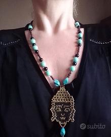 Questa collana dal fascino magnetico evoca lo stile autentico di un mala tibetano, fondendo spiritualità e artigianalità in un pezzo unico. Le pietre in resina color turchese, simbolo di protezione e saggezza, si susseguono lungo il filo creando un ritmo visivo che richiama i grani della meditazione. Il cuore della creazione è il pendente del Buddha, intessuto a mano con una trama minuziosa che ne delinea il volto sereno. Questo gioiello trascendentale non è solo un accessorio, ma un amuleto etnico che porta con sé l'energia del misticismo orientale, perfetto per chi cerca un legame profondo tra estetica e spirito.