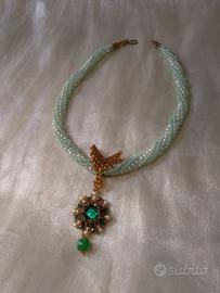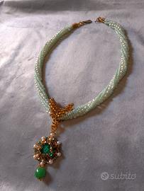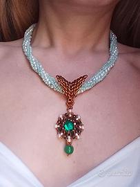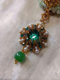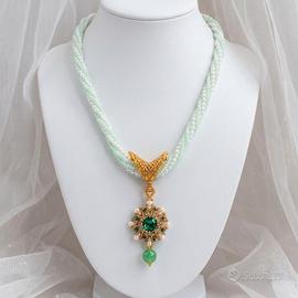 Collana fatta a mano in stile vintage Neo-barocco con pendente cobochon e gemma di avventurina verde pendente. Questa raffinata collana incarna uno stile Neo-barocco che integra perfettamente elementi vintage e moderni in un capolavoro di micro-tessitura manuale. La catena tubolare, realizzata con perle Miyuki e perle cerate, crea una struttura sinuosa che esalta l'opulenza tipica dell'estetica barocca. Il sofisticato medaglione centrale con cabochon in zirconia e il pendente in avventurina verde richiamano il lusso dei gioielli d'epoca, offrendo un design senza tempo. Lunga 43 cm e rifinita con una chiusura in ottone, l'opera fonde armoniosamente la precisione artigianale con un gusto ornamentale ricercato, ideale per chi desidera un accessorio unico e di classe.