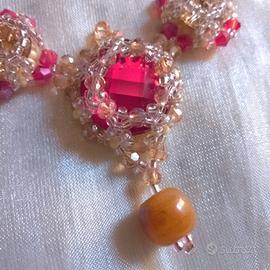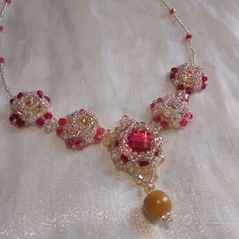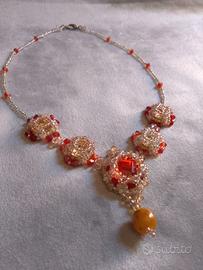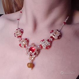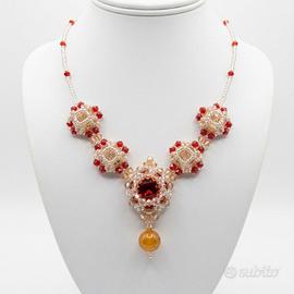 Collana artigianale stile vintage Vittoriano con Zirconia e Giada Marrone. Questa collana artigianale in stile vintage vittoriano si distingue per un design ricercato che pone al centro la lucentezza di zirconia cubica nelle tonalità del rosso e dell'ambra. La struttura, realizzata interamente in Italia con la tecnica del bead weaving, integra rondelle di cristallo e perline di vetro argentate, culminando in una pietra dura naturale di giada marrone pendente. La catena, lunga 45 cm, è composta da una trama intessuta di cristalli e vetro, rifinita con una solida chiusura a moschettone in acciaio inossidabile anallergico. La manifattura manuale esclude l'uso di colle o materiali tossici, garantendo un gioiello sicuro e durevole. Grazie al suo carattere versatile, questa creazione esclusiva in edizione unica è ideale per occasioni speciali, ma si abbina con disinvoltura anche a look casual in denim o pelle.
