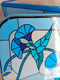 Scatola di latta decorativa con coperchio e motivo floreale a viticci, in stile vetro colorato blu e turchese.