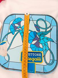 Design: Presenta un decoro che imita una vetrata artistica (stile stained glass) con fiori rampicanti, probabilmente campanule (Ipomoea o morning glory), nelle tonalità del blu e dell'azzurro.