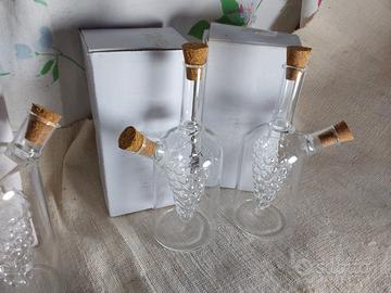 vendo collezione 5 bottigliette in vetro soffiato trasparente olio/aceto mignon con uva all'interno per l'aceto. fatte a mano con tappini in sughero per chiuderle.