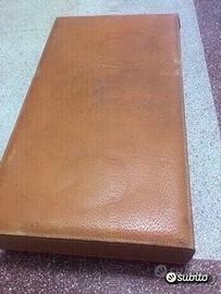 Scatola da gioco completa originale in legno rivestita in cuoio marcata Granello -Prada anni 80. Prodotta dal vecchio marchio gruppo Prada. Scatola realizzata in legno e rivestita in cuoio color miele. Completa di dadi, bicchierino per dadi sempre in legno rivestito in cuoio, carte marca Granello, fiches con logo Granello. Misura 42x22x9 cm . Oggetto di rara reperibilità. Per ulteriori informazioni contatti whatsapp 3703156623