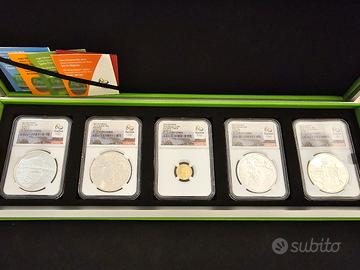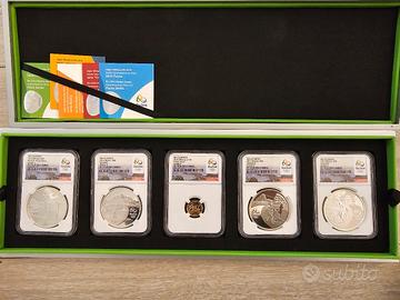 quattro diversi cofanetti celebrativi delle Olimpiadi di Rio 2016 che contengono un totale di 16 monete d'argento 925 del peso di 25 g ciascuna e 4 monete d'oro 900 del peso di 4,4 grammi ciascuna