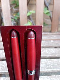 Vendo per inutilizzo un elegante set di penna a sfera e penna stilografica in legno con elementi di vero argento. Il legno dovrebbe essere palissandro. La penna ha l`inchiostro nero. L'astuccio riporta una piccola imperfezione visibile nelle foto. Perfetto come pezzo da collezione. Il set è stato acquistato in una gioielleria di Napoli.