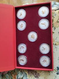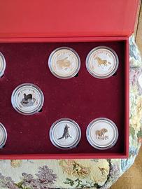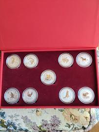 Serie collezione ,primo anno uscita al completo delle 9 monete da 1/2 mezza oncia (1/2 oz)cadauna -Australia Lunar I .dal 1999 al 2007 in argento puro grammi 15,60 cadauna (rare)fdc/fondo specchio in capsule rigide di plastica + cofanetto lusso in plastica...elenco mezze once : inizio serie 1999 anno del coniglio + 2000 anno del drago + 2001 anno del serpente + 2002 anno del cavallo + 2003 anno della capra + 2004 anno della scimmia + 2005 anno del gallo + 2006 anno del cane + 2007 anno del maiale fine serie .Tutto come da fotografie (fanno parte della mia collezione privata).Serie molto rare..Per qualsiasi domanda inerente le mezze once.,potete contattarmi al mio cellulare 3477674665 o WhatsApp senza nessun impegno. Spese di spedizione a carico acquirente con pacco postale assicurato di euro 20.