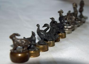 Rara collezione di 10 tappi in metallo argentato, di inizio 1900, di manifattura tedesca. Questa collezione, curata negli anni da appassionato del genere, è in buono stato di conservazione e propone diversi soggetti, tra cui animali e gnomi ubriachi. Le foto rappresentano il bene così come venduto.