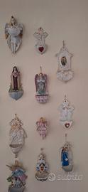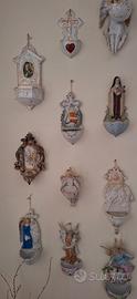 Vendo una splendida collezione composta da 19 acquasantiere antiche in ceramica e porcellana, databili tra fine Ottocento e inizi Novecento. Ogni pezzo (alcuni in coppia) presenta soggetti sacri tradizionali: Madonna, Sacro Cuore, angeli, santi, decorazioni a rilievo, dorature e pittura a mano. Si tratta di una raccolta selezionata nel tempo, ideale per: – collezionisti – arredo vintage o shabby – allestimenti scenografici – negozi di antiquariato o interior design Tutti i pezzi sono in ottimo stato per l’età, senza rotture strutturali. Eventuali piccole usure sono coerenti con l’epoca e aggiungono fascino. – 60 € cadauna – 900 € l’intero lotto (preferenza per vendita in blocco) Possibilità di spedizione con imballo molto accurato oppure ritiro a mano.