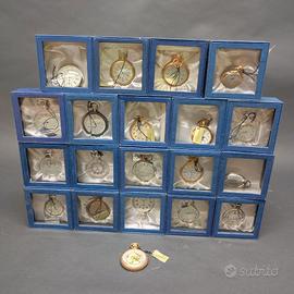 Lotto composto da 20 orologi da tasca mostrati in confezioni singole con vetrina trasparente e fondo in stoffa / raso provenienti da raccola venduta in edicola.
