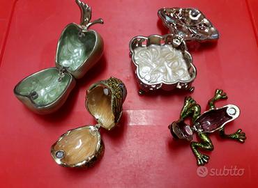 Collezione modernariato di piccole portagioie stile Fabergé, in metallo con dettagli smaltati e cristallini, che rappresentano una mela con foglia, un elemento floreale, un uccellino, una rana, misure max 6x5x6 cm.