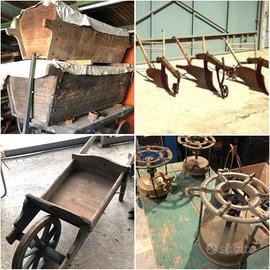 ARTI E MESTIERI DEL PASSATO, vastissima raccolta di attrezzi e oggetti inerenti i mestieri ma anche la vita quotidiana del passato, dai carri agricoli fino ad arrivare alle vecchie posate di ottone, suddiviso in settori artigianali come il maniscalco, la vendemmia, il macellaio, il mugnaio, il sarto (25 e più modelli di macchine da cucire Singer funzionanti), la cucina, la camera da letto, ecc ecc. Ideale per allestire un museo e/o laboratorio didattico suddiviso in varie attività della fine 800 e inizi 900. Disponibili molte altre foto. Preferibile la vendita in blocco a 15K oppure valutabile la vendita di singoli pezzi con prezzo da concordare.