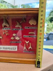 teca espositiva contenente una collezione di fossili di denti e vertebre di squali e rettili marini estinti, con etichette che ne indicano la specie e la parte del corpo fossile.